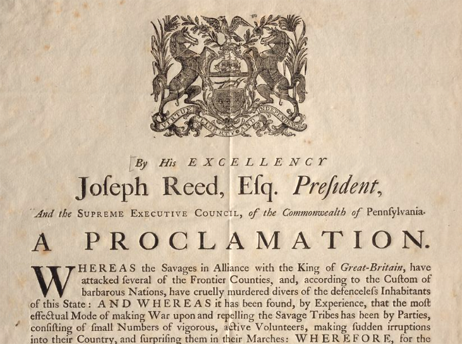 Pennsylvania Scalp Bounty Proclamation, passed April 22, 1780. “By His Excellency Joseph Reed, Esq. president, and the Supreme Executive Council, of the Commonwealth of Pennsylvania.” A proclamation. Library Company of Philadelphia Broadsides, Philadelphia : Printed by Francis Bailey, 1780 #Am 1780 Pen Cou 953.F.45,